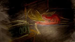 Por otro lado, punto negativo es que quizás la técnica le roba la participación a la historia, pues no logro entender bien la a historia, ya que las figuras a veces se vuelven tan confusas que no se logran amarrar bien las situaciones. No obstante la oscuridad presente en las imágenes y la utilización de los colores provoca en el público un interés por entender las imágenes y me envuelve de tal forma que me lleva a observar las demás.